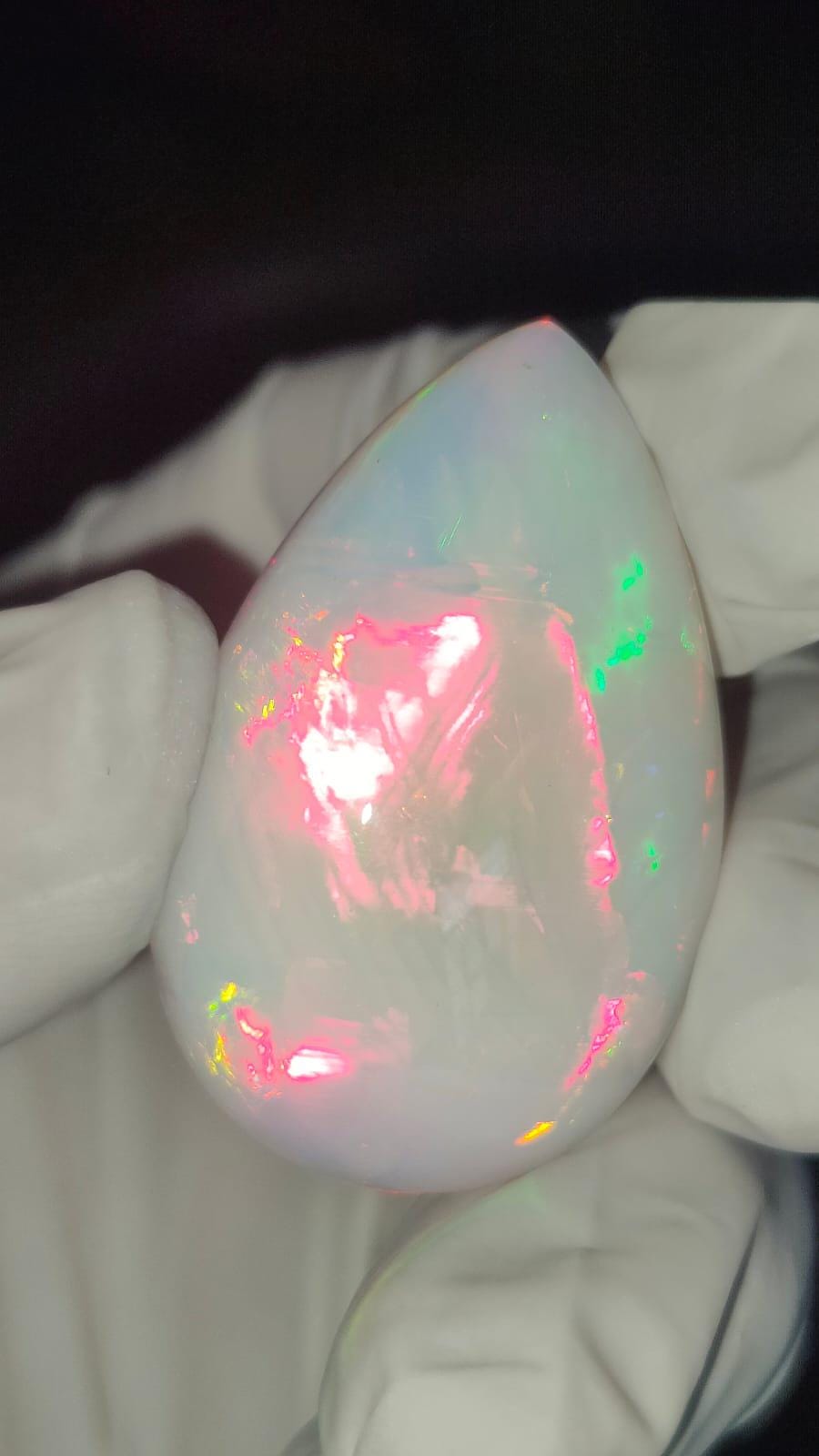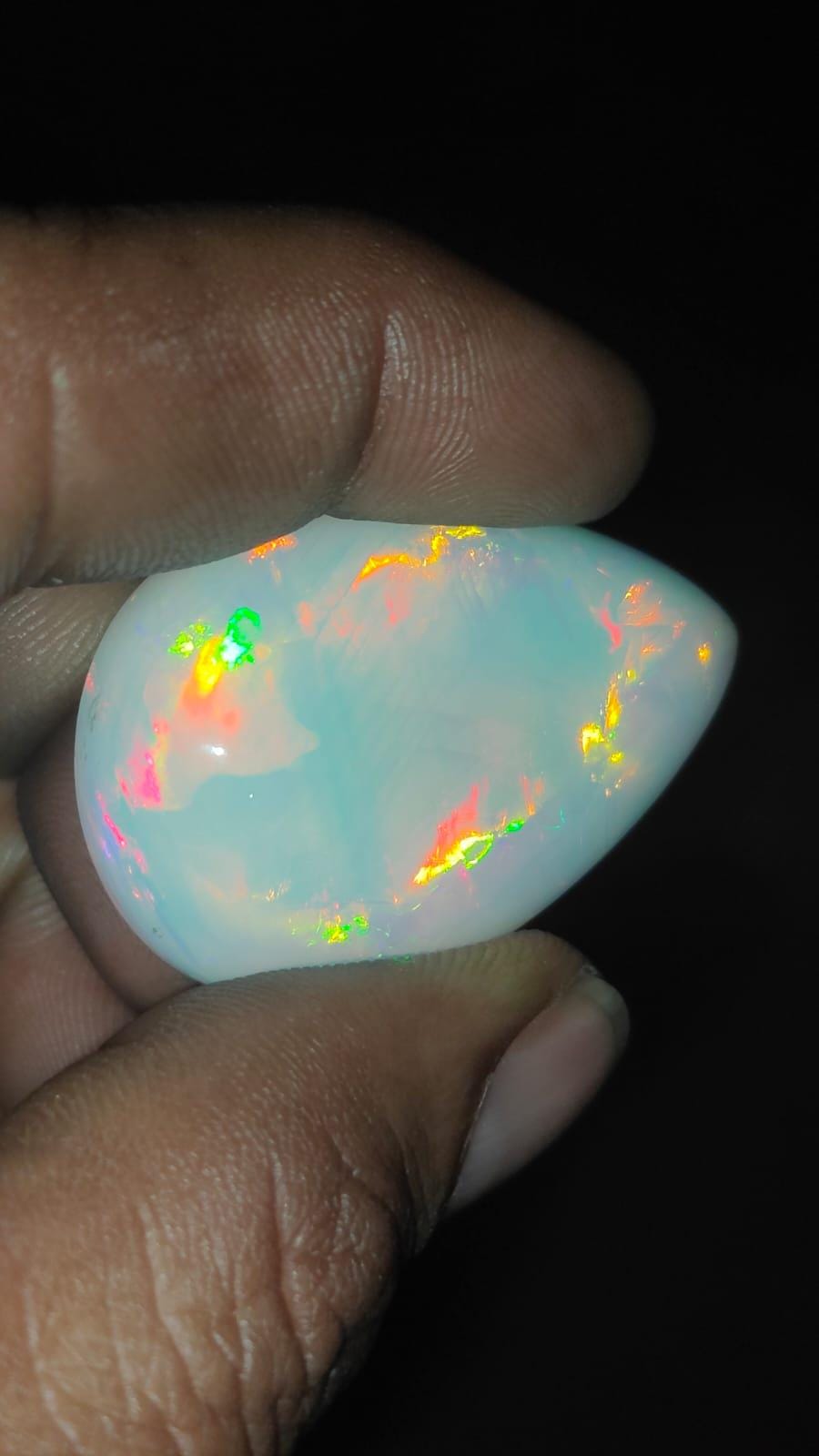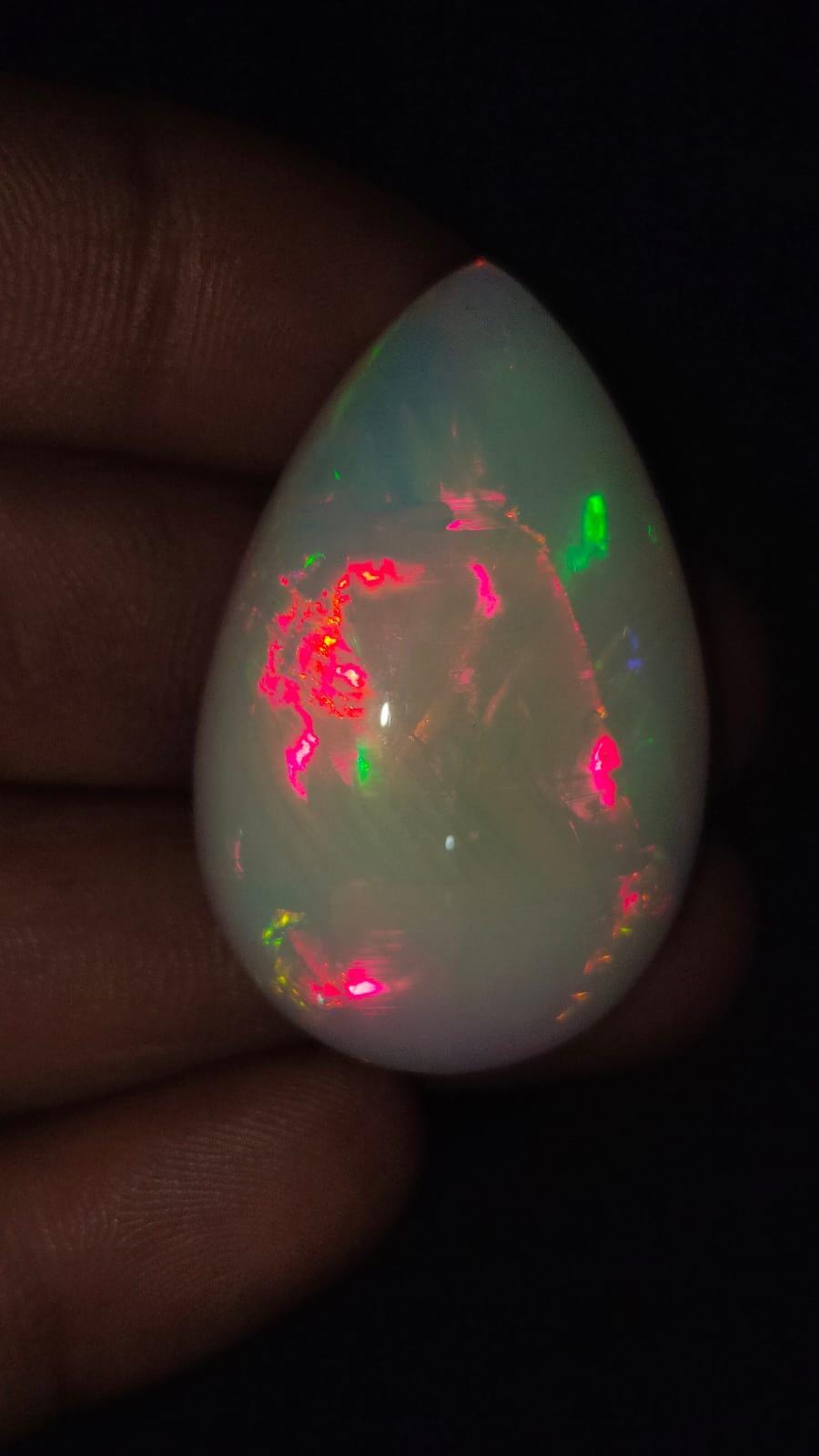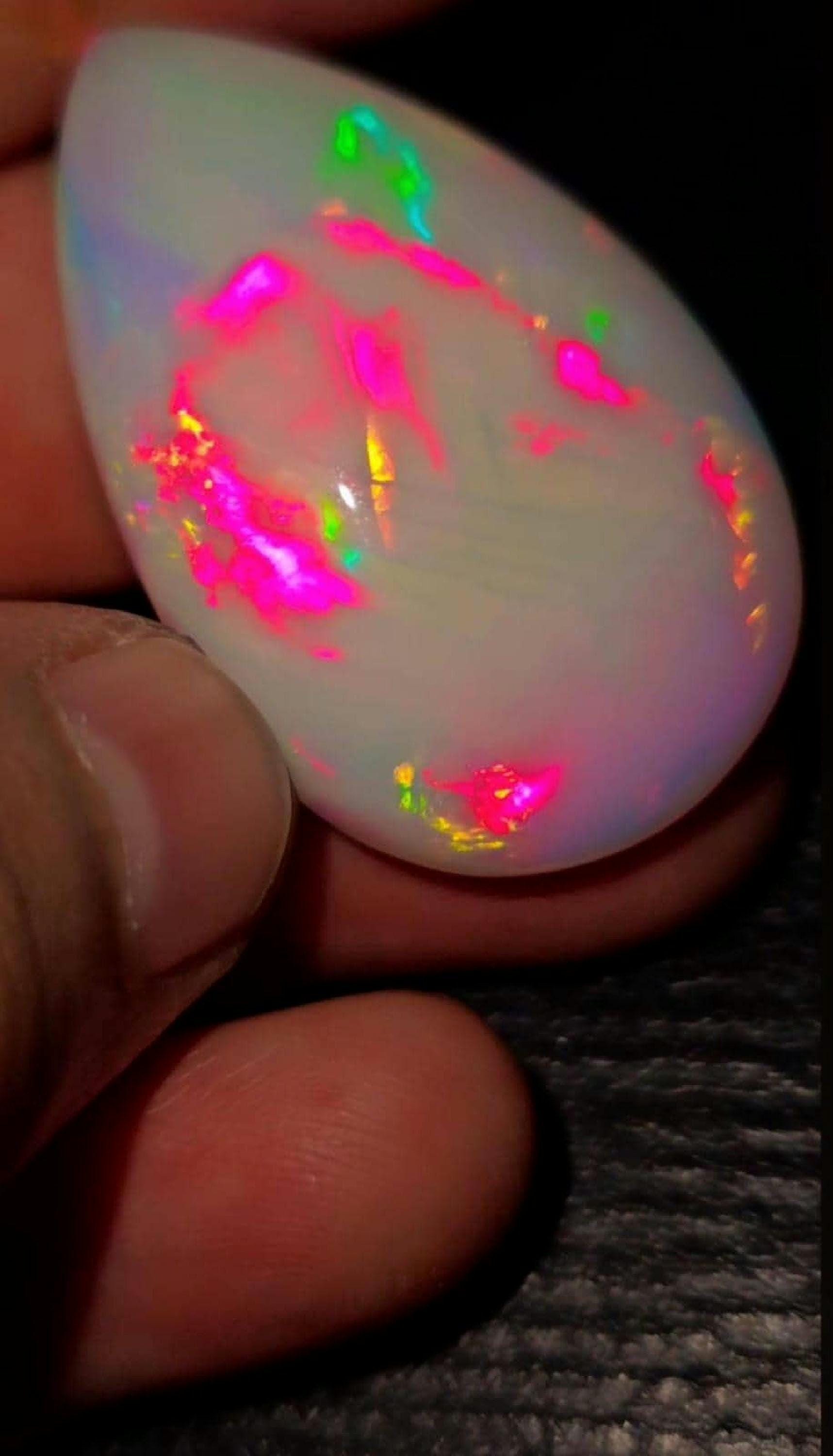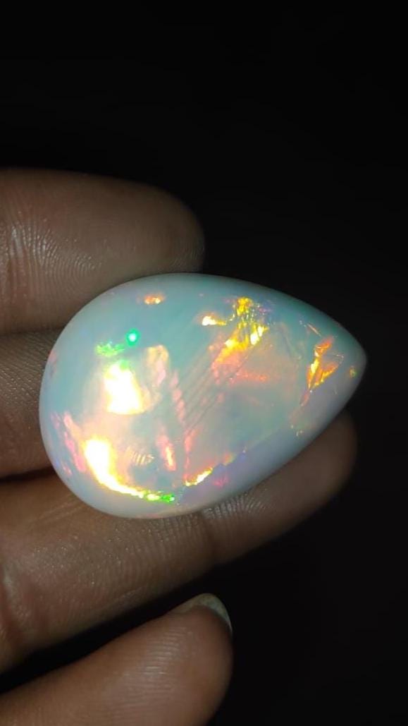 Experience the natural charm of Ethiopian opal with this stunning pear-shaped cabochon. Weighing 70 carats and sized at approximately 26x15x11 mm, this captivating piece reveals the lively play of color that makes Ethiopian opals so distinct.